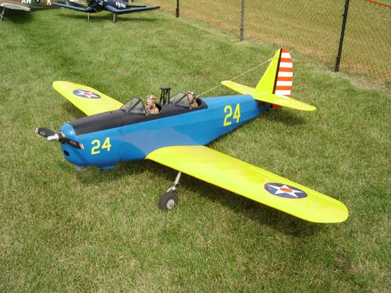 Förutom dessa warbirds hade Tim ställt upp sin 1/2-skala Cub. Den är faktiskt lite större ändå. Den är 60% av originalet, så ett barn i småskoleåldern kan utan vidare sitta inne i den. Han har telemetri installerad så när han flyger kan man följa alla instrument från en PC på marken.