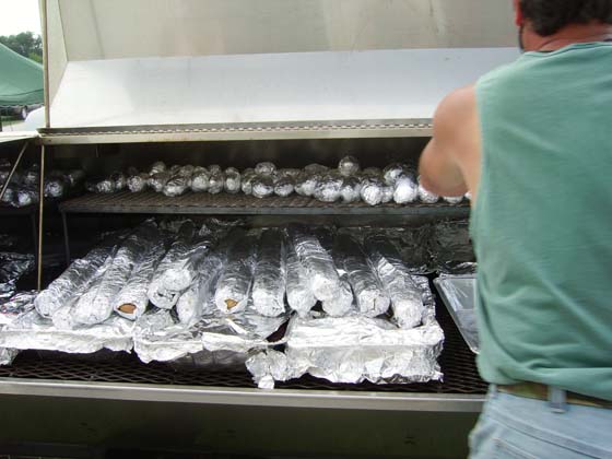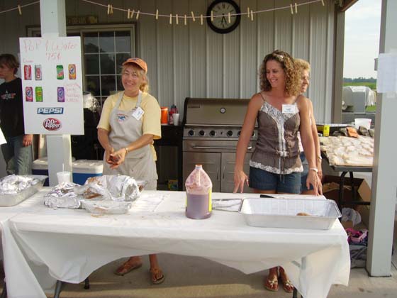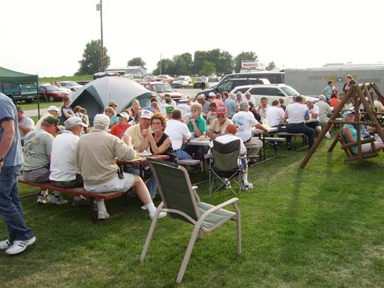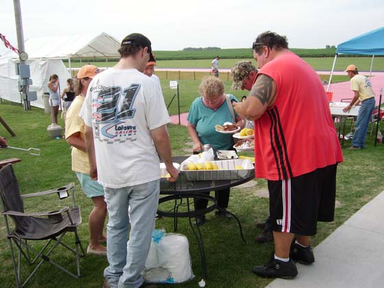 Nästa helg är det en jetmaskinträff i Rushford en liten bit åt andra hållet och helgen efter det så går den 6'e ORRO-träffen av stapeln. Då är det enbart helikopter här. Vid mitt förra besök 2003 var det 100 piloter och runt 150 maskiner. Ska bli intressant att se hur det blir i år. Men innan vi kommer så långt måste dagen avslutas med middag innan kvällsflygningarna tar vid. För 10 dollar (~75 kr) håller Karen med tjocka revbensspjäll, bakad potatis, bröd och kokta majskolvar med smör och du får äta så mycket du orkar. De nästan tvingar på en mer. Undra på att amerikanarna sväller på bredden om det här är en standardmåltid. Och sen blev det prisutdelning och lotteridragning.