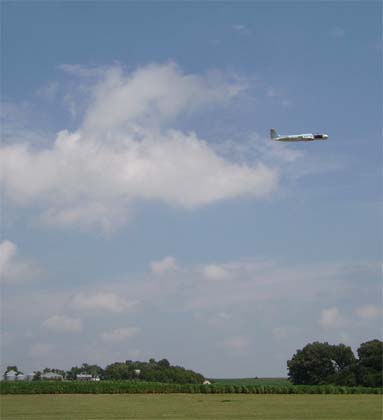 Vidare var det en stor P-61A "Black Widow" som inte hade nog tryck i motorerna utan klippte en gren efter starten och sånär lyckades ta sig hem. Som tur var odlade Tim inte majs detta år så grödan gick inte folk över huvudet när de skulle hämta upp den. Förra gången jag var här fick man sätta en T-tröja på en pinne och hålla upp så de som var spotters visste var folket ute i fältet befann sig och sen dirigera via mobiltelefon. Majsfält växer höga. Åtminstone i USA.