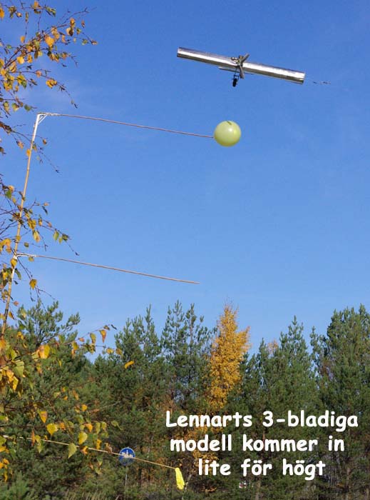 Jag hade även med mig en gammal och sliten helikopter och eftersom reglerna inte specificerar vad man får flyga med hade jag tänkt att hovra in i ballongerna utan att passera pinnen. Reglerna tillåter att man får hålla på hur länge som helst, så med lite försiktighet skulle det nog gå. Då skulle jag få max poäng och inga minus. Det skulle ju ingen kunna knäcka. Men tävlingsledningen och enväldige domaren Calle Carlén avslog det med hänvisning till att helikoptern inte styrdes med linor trots att han själv osportsligt nog använde flaps på sin maskin.
