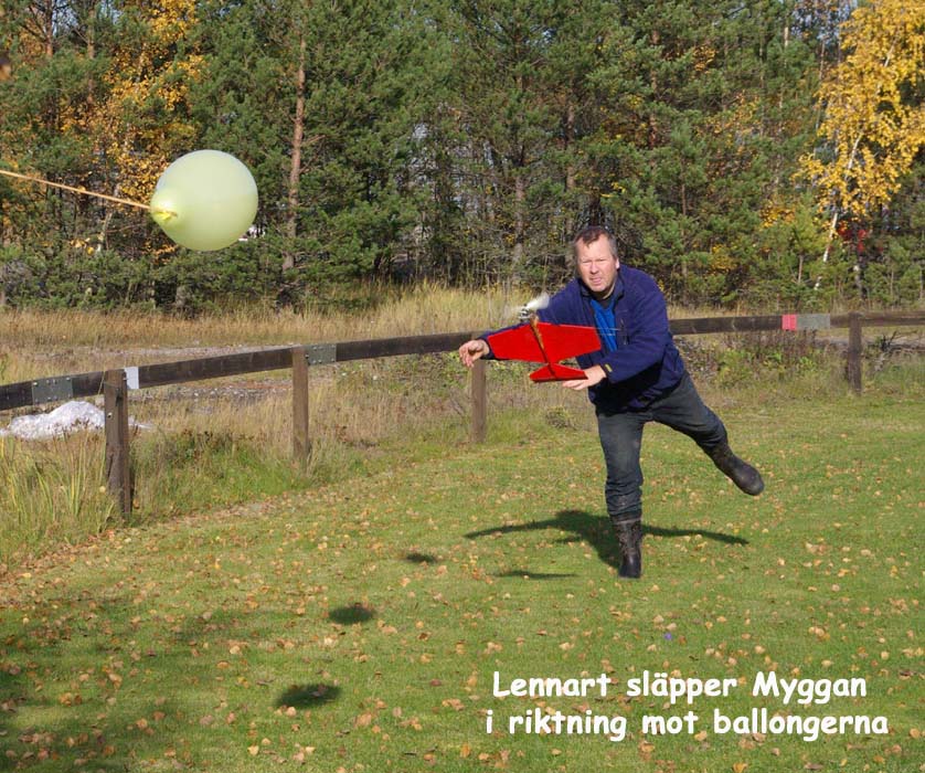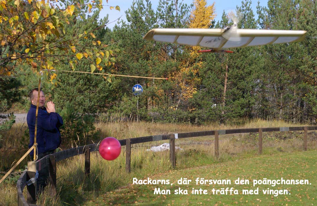 I år svek ungdomarna. De vågade väl inte utmana de distingerade herrarna som gjorde upp om titeln Årets Ballongmästare. Något orättvist använde överdomare Carlén en maskin med flaps vilket gjorde honom oövervinnlig denna gång. Detta år hade ballongerna flyttats så att i rådande kyttiga vindar fick man ett rejält lyft precis när man siktat in sig. Nästa varv siktade man förstås lite under, men då kom ingen vindby och så missade man i alla fall. Kanske man till nästa år skulle ta med en gammal speedmodell, för den flyger i stort sett enbart på centripetalkraften. Fast å andra sidan skulle den aldrig lyfta för då behövs asfalt.