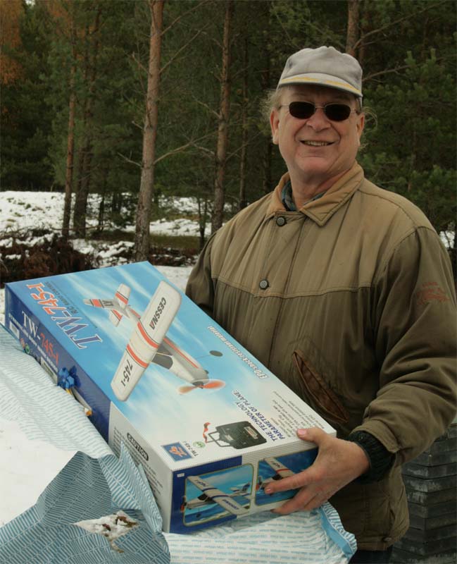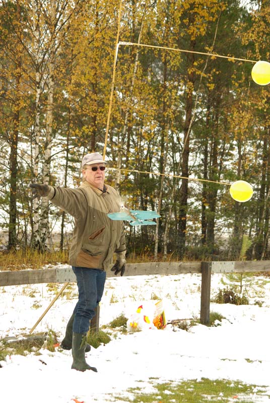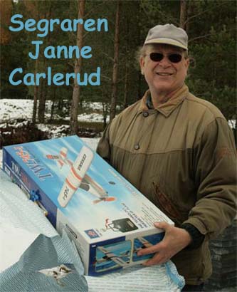 ständige kassör Janne Carlerud, inte bara fick större ballonger att pricka, utan även viss assistans att panga dem. Så han segrade och fick dessutom ett radiostyrt flygplan som belöning. Förklaringen kom när domaren meddelade att pristagaren fyllde 70 denna helg. Annars hade Calle själv vunnit. Den gubben flyger en gång om