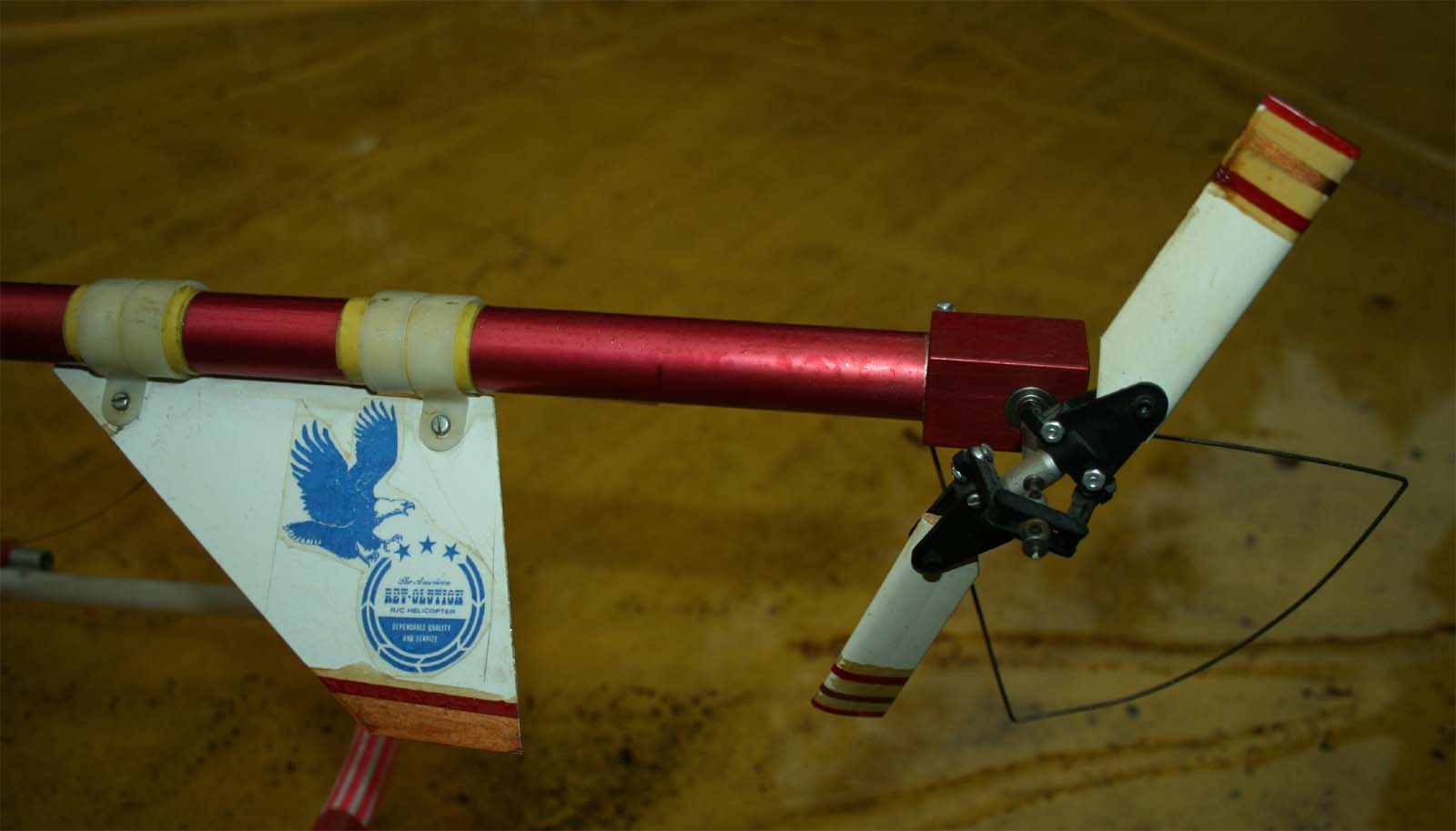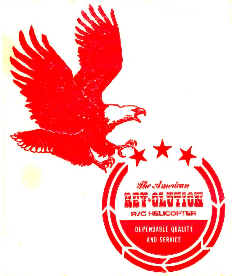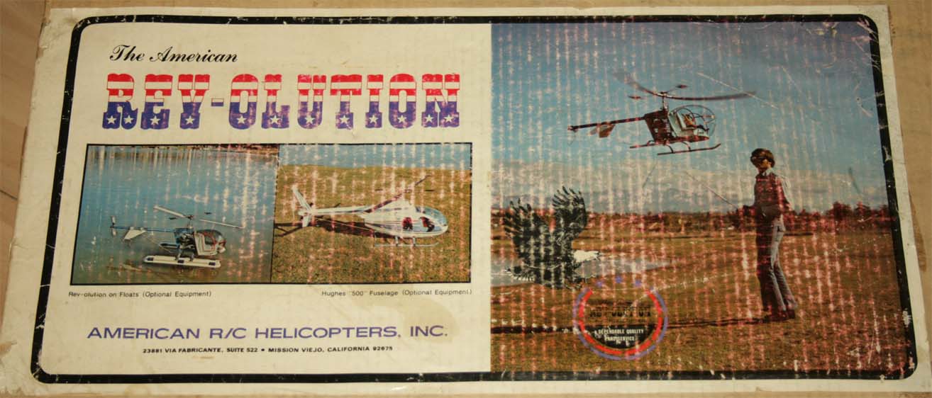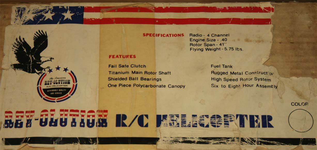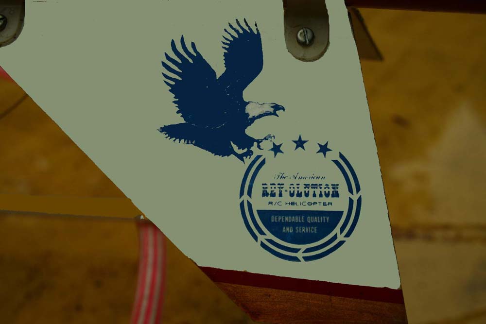 Det står "An American REV-OLUTION R/C Helicopter" på dekalen även om det är svårt