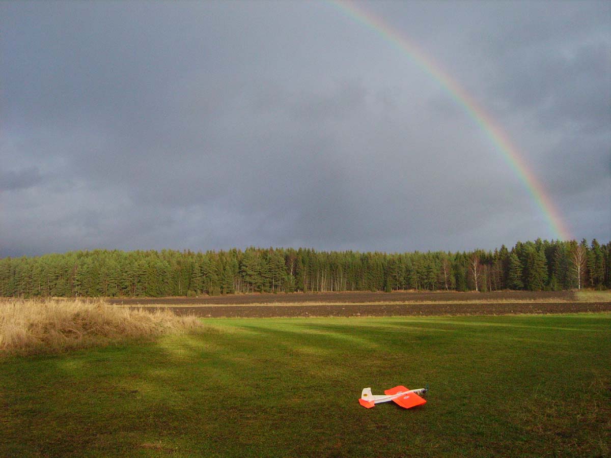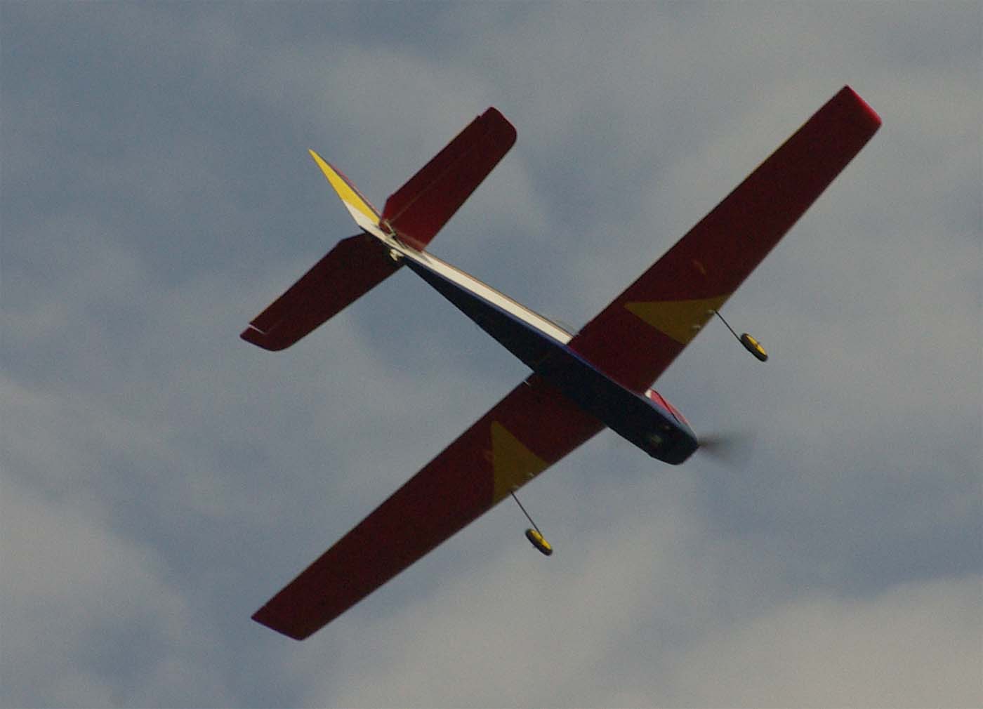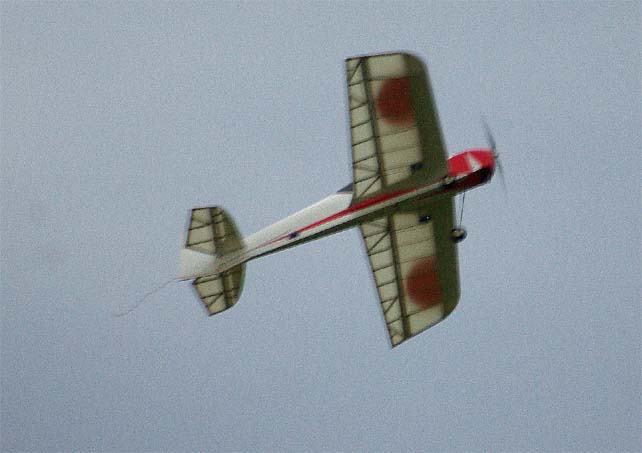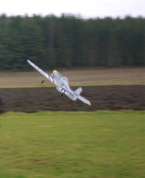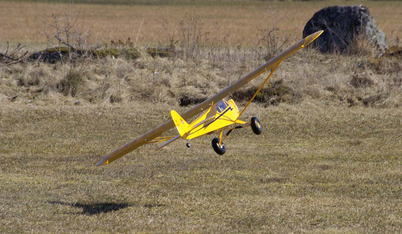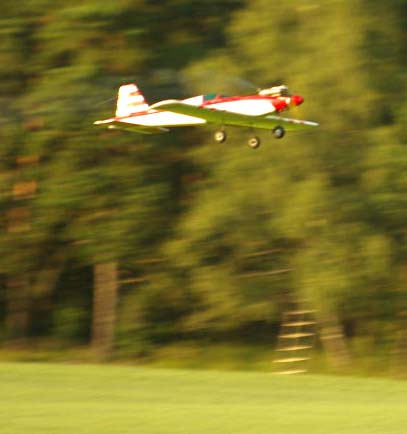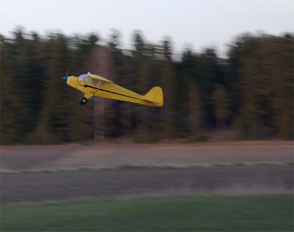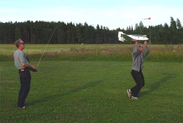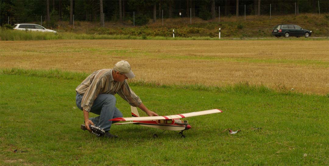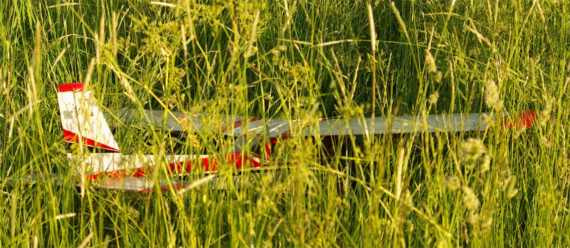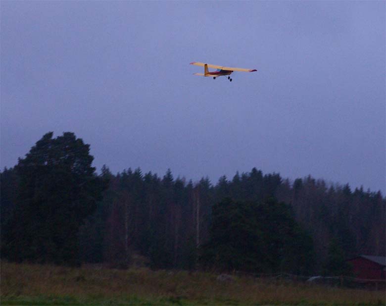 nervositeten att flyga en modell utan skevroder strök han förbi fältet på låg