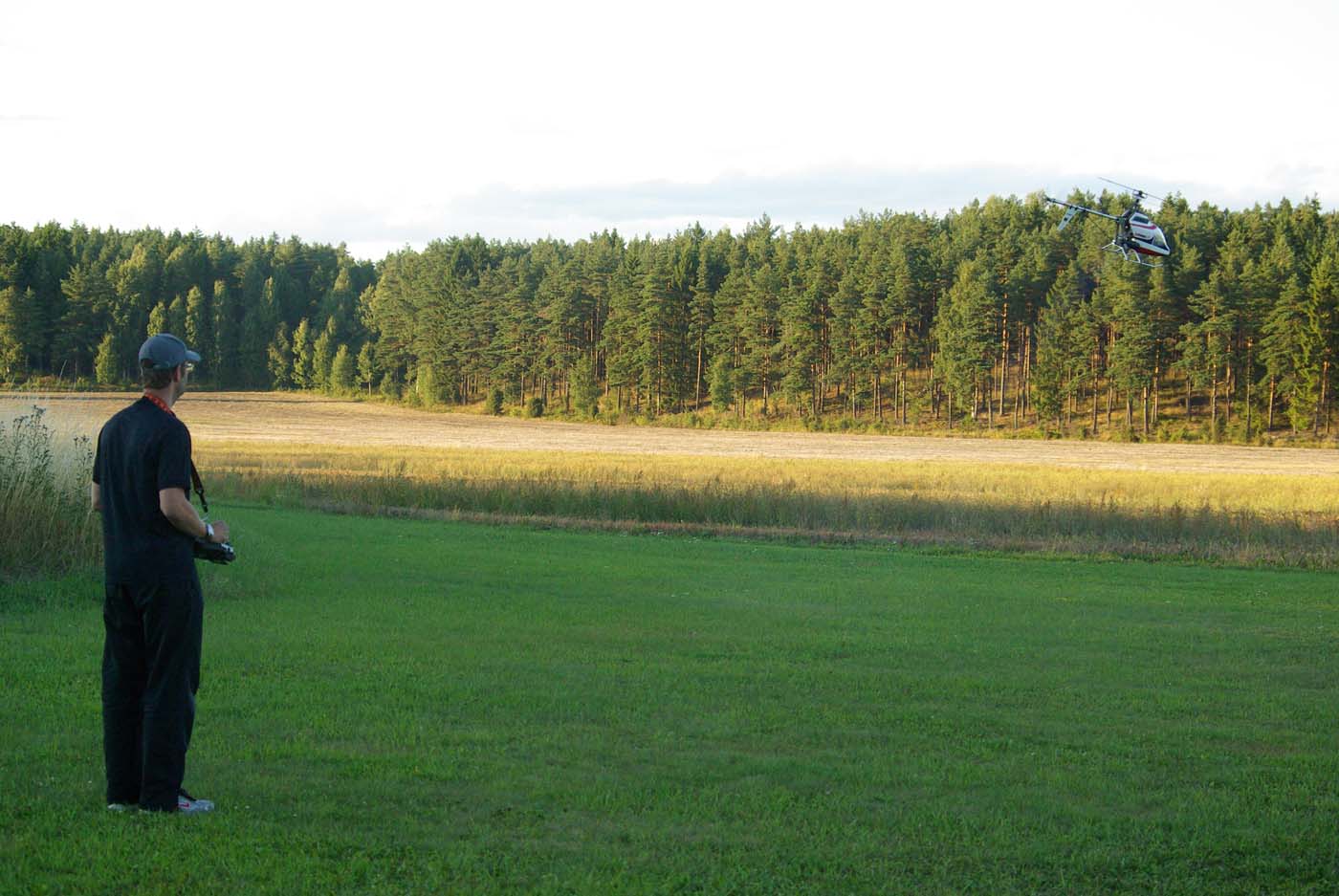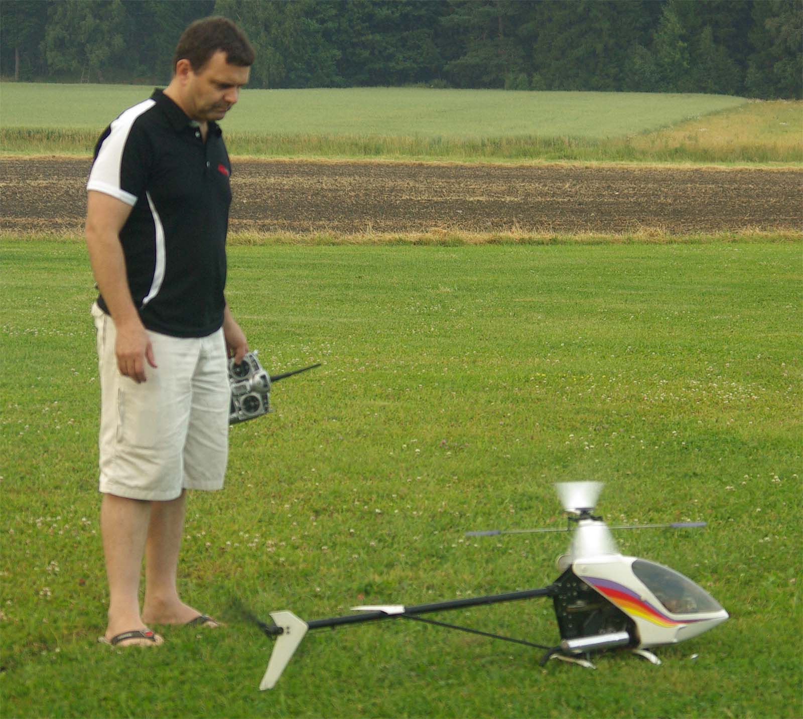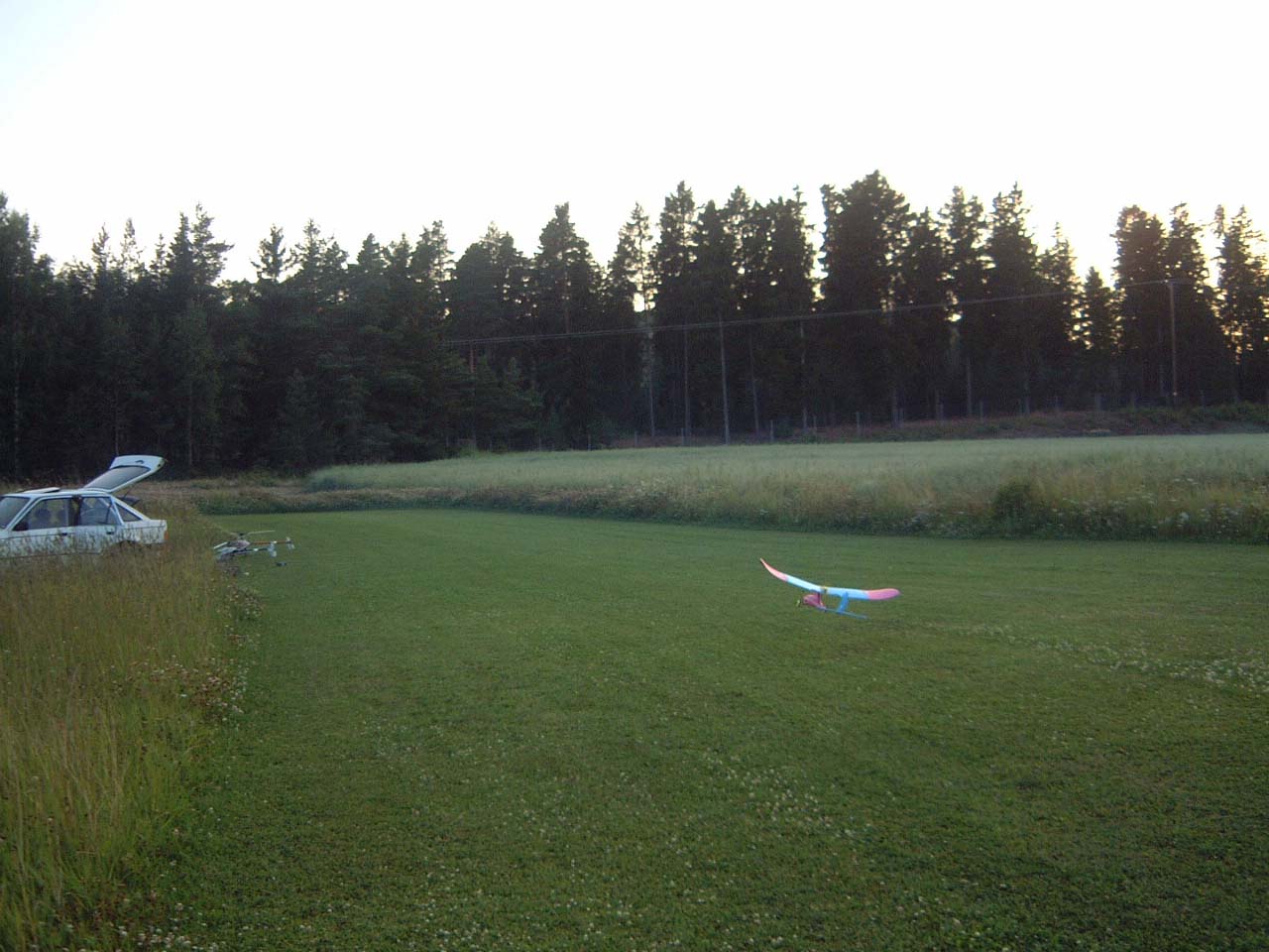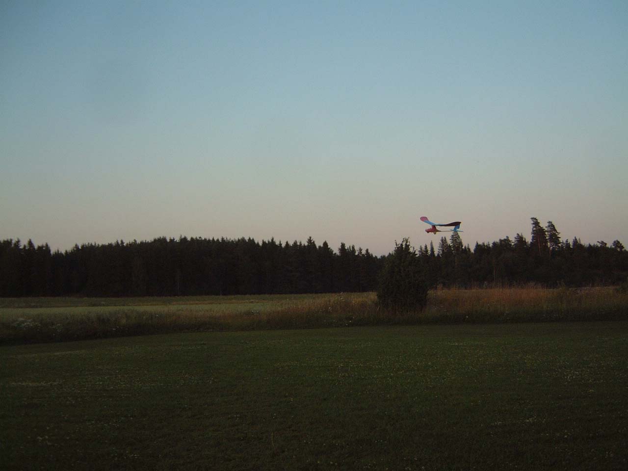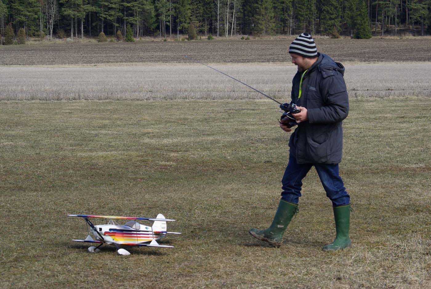 nervositeten att flyga en modell utan skevroder strök han förbi fältet på låg