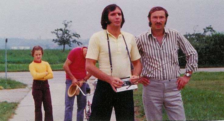 Från vänster: Eberhard Hof, Dieter Schlüter, piloten och Cobraägaren Ewald Glanzer.