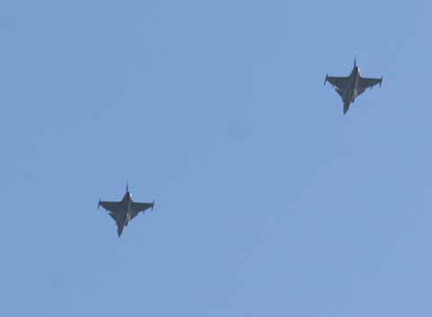 Helt plötsligt när vi stod där kommer två JAS 39 Gripen flygande, i rote, rakt över fältet. Härligt ljud och kul att se. Han precis få upp kameran och knäppa ett par bilder.