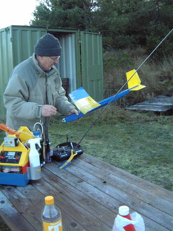 Christer provade sin nya leksak men det blåste för mycket för den lilla myggan