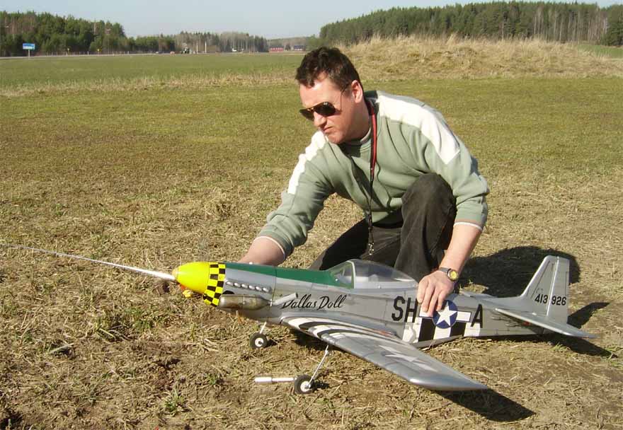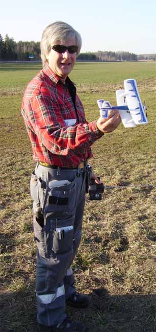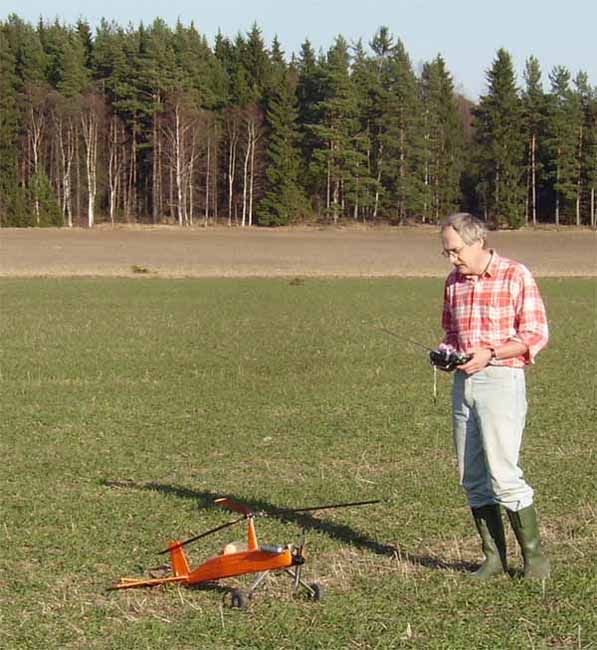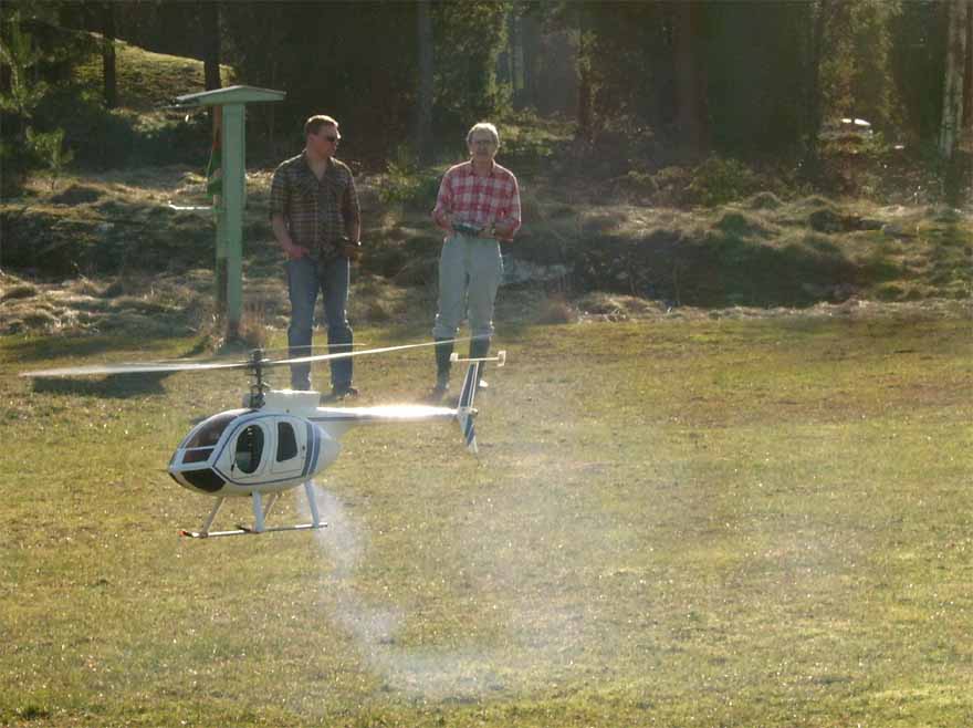 Själv hade jag åter med Hughes 500'an och fick hjälp av Petri att justera in länkar och servon. Ett elände hade vi att få liv i motorn, men envisa som vi är gick det till slut. I luften var den dock inget kul. Stjärten vispade åt alla håll. Vi ökade känsligheten till max. Ingen förändring tills vi såg en liten omkopplare på andra sidan och när man petade till den började det yla inuti kroppen. Helikoptern var utrustad med ett gammaldags mekaniskt gyro vars lager nog sett bättre dagar att döma av ljudet. Efter det gick det faktiskt att styra den lite grand, men det måste nog bytas till något modernare innan man törs ta den på några längre utflykter. Ett par kort hann vi med i alla fall.