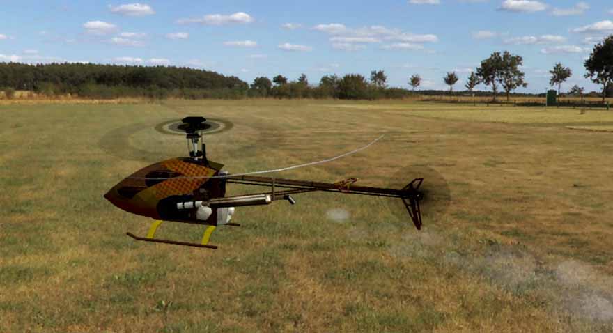 Synd bara att alla modellhelikoptrar lutar åt sidan (utom de med dubbelrotor) för att kompensera avdriften som stjärtrotorns sidoriktade luftström genererar.