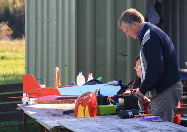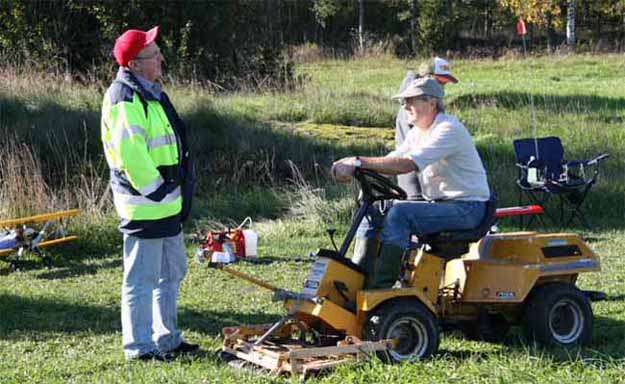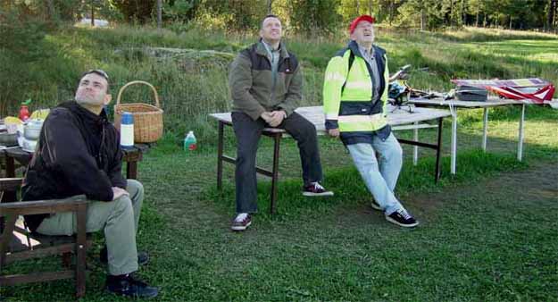 En himla tur hade de, för ett par timmar senare kom Simon och hans pappa tillbaks och låste upp för den hårda vinden hade mojnat. Svampplockarna var väldans förvånade att vi stänger och elakt nog också låser grinden. Att de stod parkerade på ett modellflygfält hade de ingen aning om. De trodde alla bilarna tillhörde andra svamp och bärplockare. Undrar hur stor informationstavla vi måste göra för att folk ska fatta? Kanske vi skulle måla dit en kantarell också? Eventuellt skulle de då bli intresserade och gå fram till skylten och möjligen kanske också läsa och förstå att de befinner sig på ett modellflygfält och inte i svampskogen.