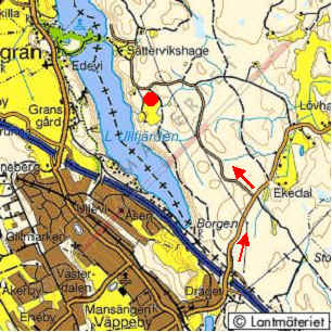 - Efter c:a 3 km kör du under en mindre kraftledning (svarta strecket vänstra bilden ovan). Du är strax framme.
