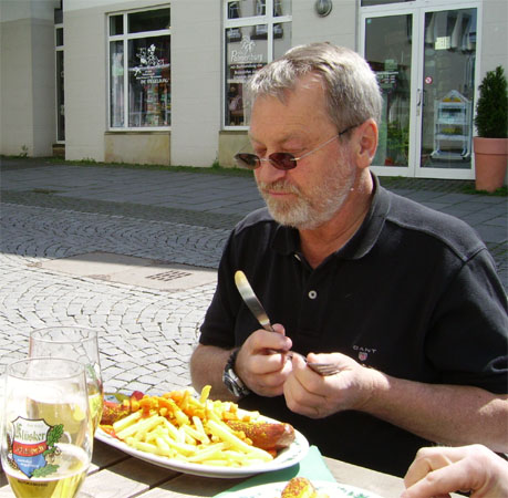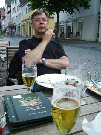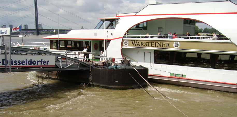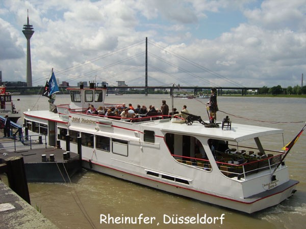Vårt flyg avgick sent på eftermiddagen, så sista dagen tog vi det lugnt och minglade i folkvimlet på Rhenkajen i Düsseldorf. Lite mat och några öl i solskenet satt inte fel. Men det gäller att inte trilla i. Uppskattningsvis håller nog Rhen en fem-sex knop. Undrar hur sjöpolisen mäter hastigheten när det är så strömt? Är det fart genom vattnet som gäller tro? De kan ju inte gärna stå på en bro med laserpistolen för det är olika fart på vattnet beroende på hur djupt det är.