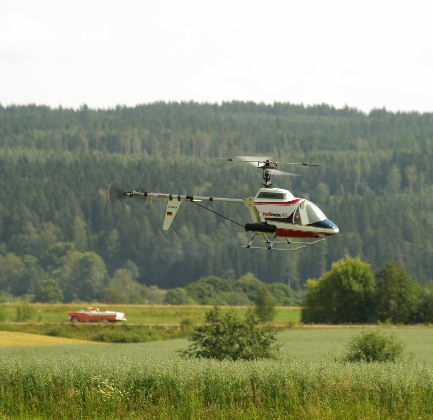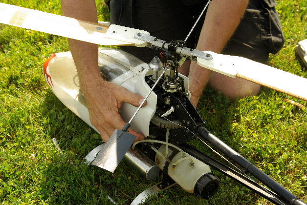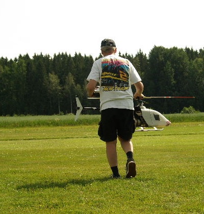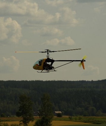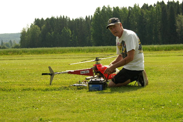 Danne innehar ett antal Concept-helikoptrar och kunde inte för sitt liv komma ihåg vilket modellminne som hörde ihop med den andra Concepten? Han fick hugga ett som det stod Concept på i sändaren och hoppas att det mesta av inställningarna stämde. Efter ett par kanalreverseringar men i övrigt inga justeringar tog helin till väders och visst måste spakarna hållas lite på trekvart, men inte värre än att det gick att flyga lugnt och stilla precis som det gick till på den tiden. Med originalradioutrustningen intakt går det inte att ta ut svängarna hur mycket man än vevar med radiosändaren. Allting rör sig helt enkelt för sakta, så det är bara till att gilla läget. Magnus Hammarkind har dock bättre koll och modernare utrustning i sina gammelhelisar och flög friskare. Trots det vägrade hans Heli-Baby att vara med på noterna. Troligen hade den fått värmeslag. Upp kom den, men inte just mer än så. Utan nitroinblandning tröt orken.