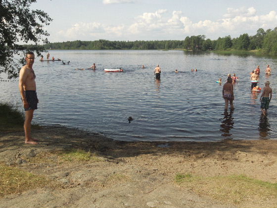 När vi vände kosan hemåt vid 3-tiden på eftermiddagen stod temperaturmätaren i bilen på 32 grader. På grund av den icke fungerande luftkonditioneringen fick det bli en avstickare och halvhalt vid Silvköparen för ett svalkande dopp. Sjön är egentligen konstgjord då man under senare delen av 1400- och början av 1500-talet började dämma upp sjöar och våtmarker för att få vattenkraft till hyttorna, smältverken samt till pumparna som höll Sala Silvergruva vattenfri. Vara som det vill med sjöns tillkomst var det svalkande stoppet vid badplatsen med tillhörande camping inte helt fel.