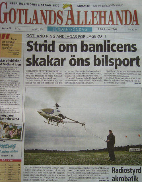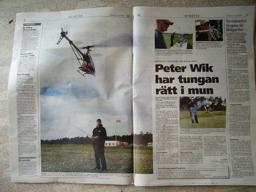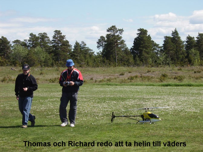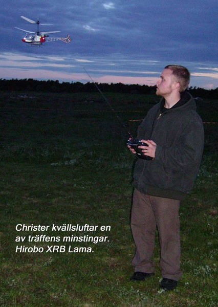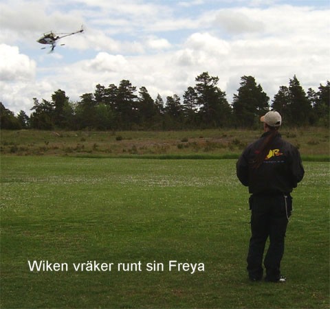 och flyg. Det hade ju redan kommit åskådare. Fortfarande hård vind så min Hughes 300 skuttade mest omkring i byarna. Inte det minsta skalalikt uppförande. Lappen och Wiken for dock obekymrat runt med sina Freya-helisar och Wiken doppade rotorbladen så gräset yrde.