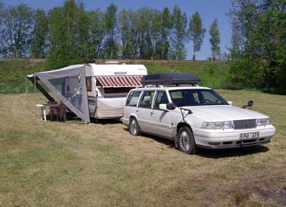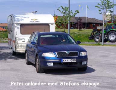 Väl uppe på motorvägen närmade sig denna husvagn med rejäl fart. Märkligt tänkte jag. Det borde vara Stefan för han stod bakom mig på färjan och han brukar inte överträda fartbegränsningarna. Åtminstone inte så där våldsamt. Min raka Volvo 6'a tycker inte om den lagliga släpvagnsfarten utan vill helst ligga och tuffa runt 100. Men trots det var den här snart ikapp och det var inte Stefan och Petri. Nåväl, den försvann snart ur sikte framöver.