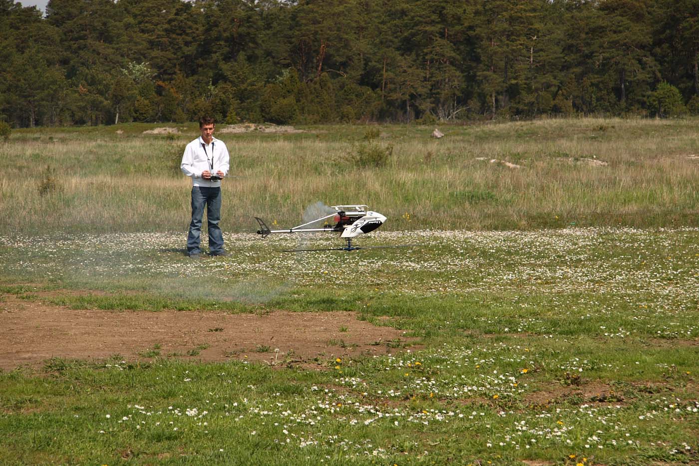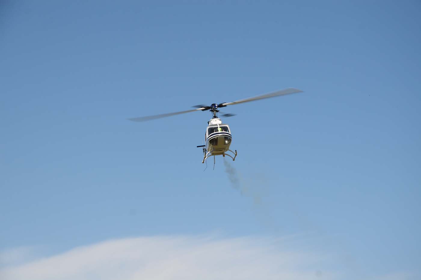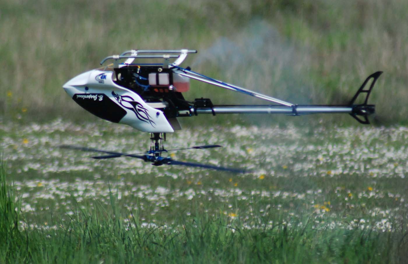 3D-flygarna är i farten viner det om motorn och det smattrar på bra i rotorbladen. Knappt så man uppfattar skillnaden mot en väldämpad metanolare förutom att den vita rökstrimman fattas förstås.