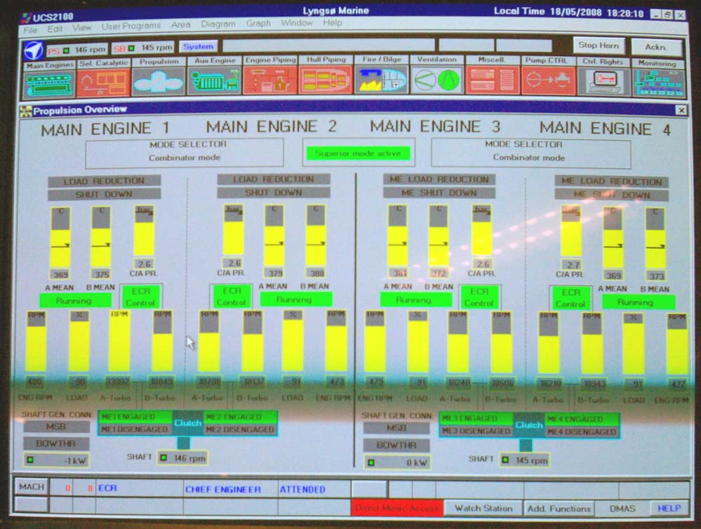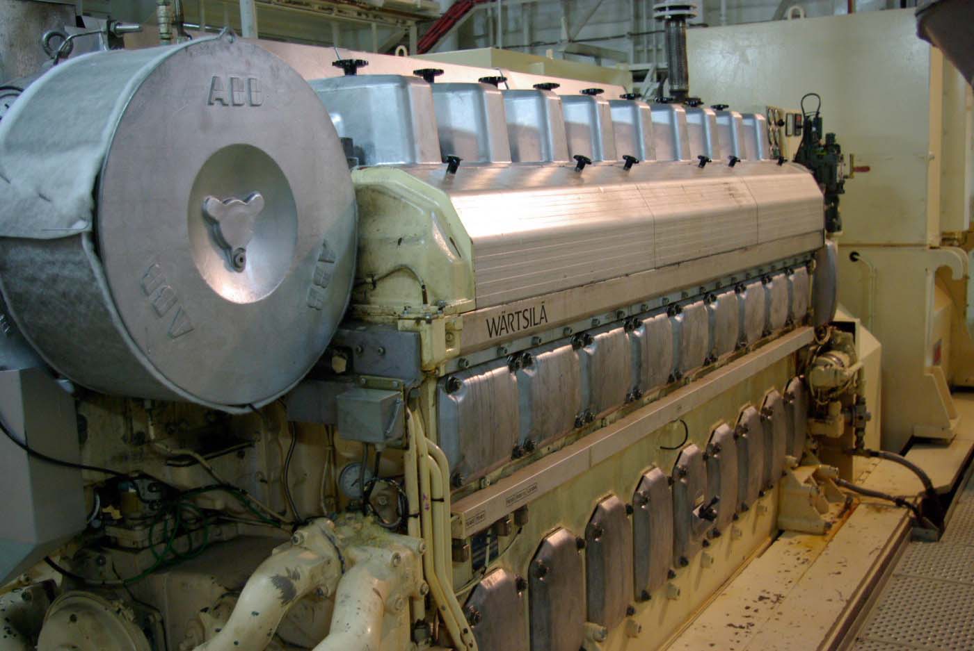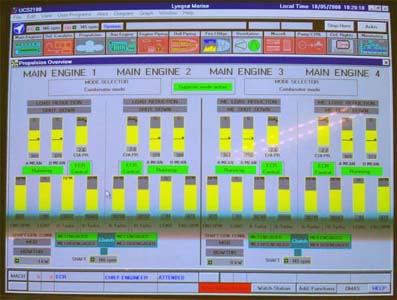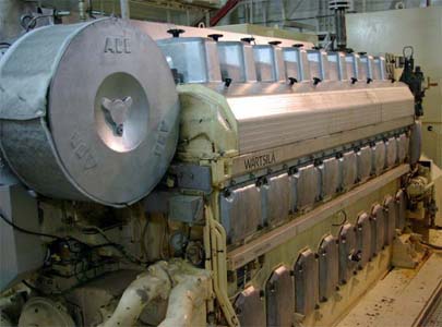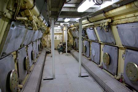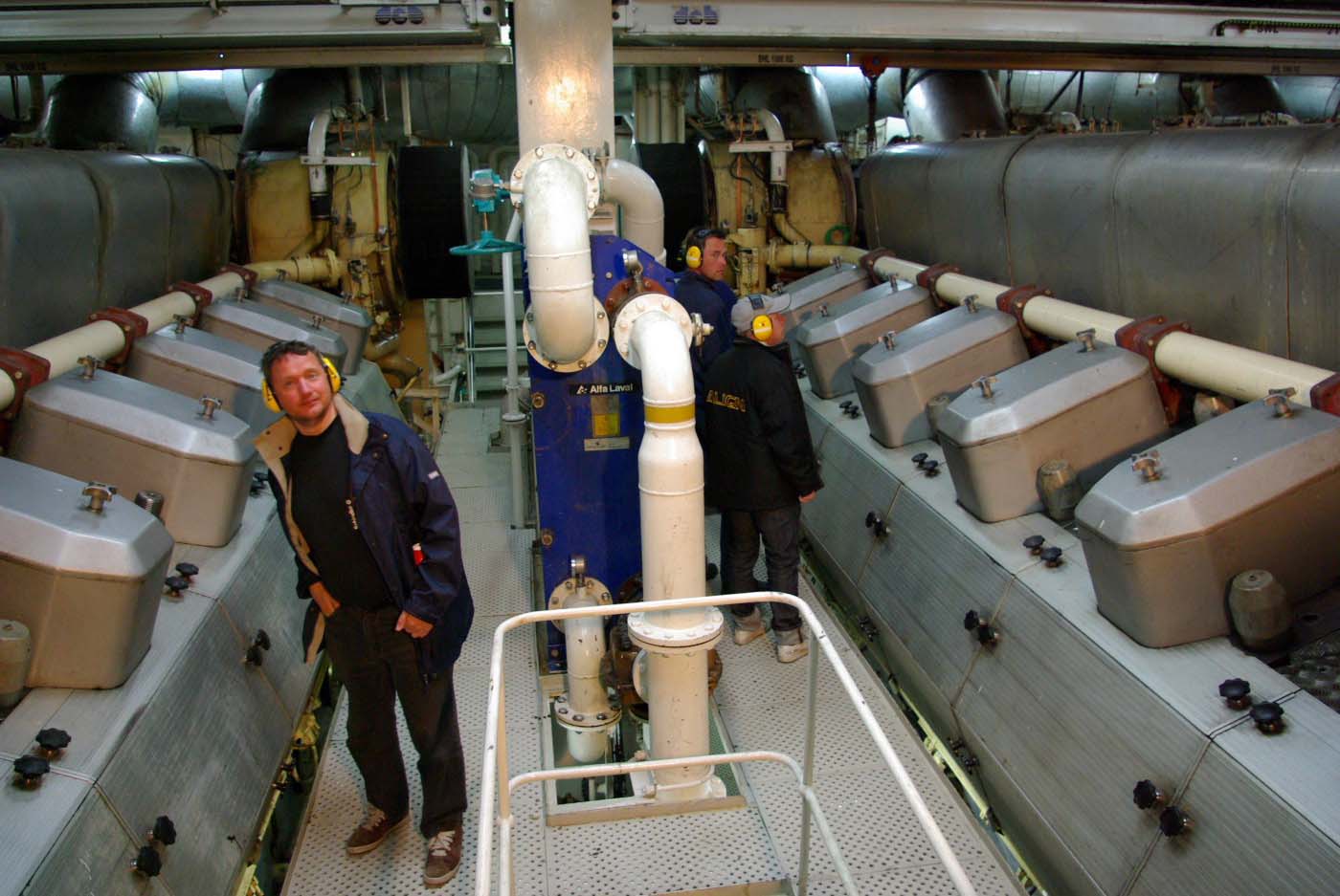 Färjan har fyra motorer varav två driver samma propeller. Alla sektioner är vattentäta varför man inte kan komma till nästa förrän föregående sluss är stängd. Vi kommer alltså in i ett dundrande utrymme där man blickar ner på fyra dieslar. De var visserligen var rejäla bumlingar men inte så hemskt stora som man skulle föreställt sig. 65.000 hästar. Tja, det kanske de kan ge? De var ju i alla fall en två meter höga och sex meter långa och de hade namnskyltar med ett välkänt företag från vårt östra broderland. Jaha, det var ju intressant.