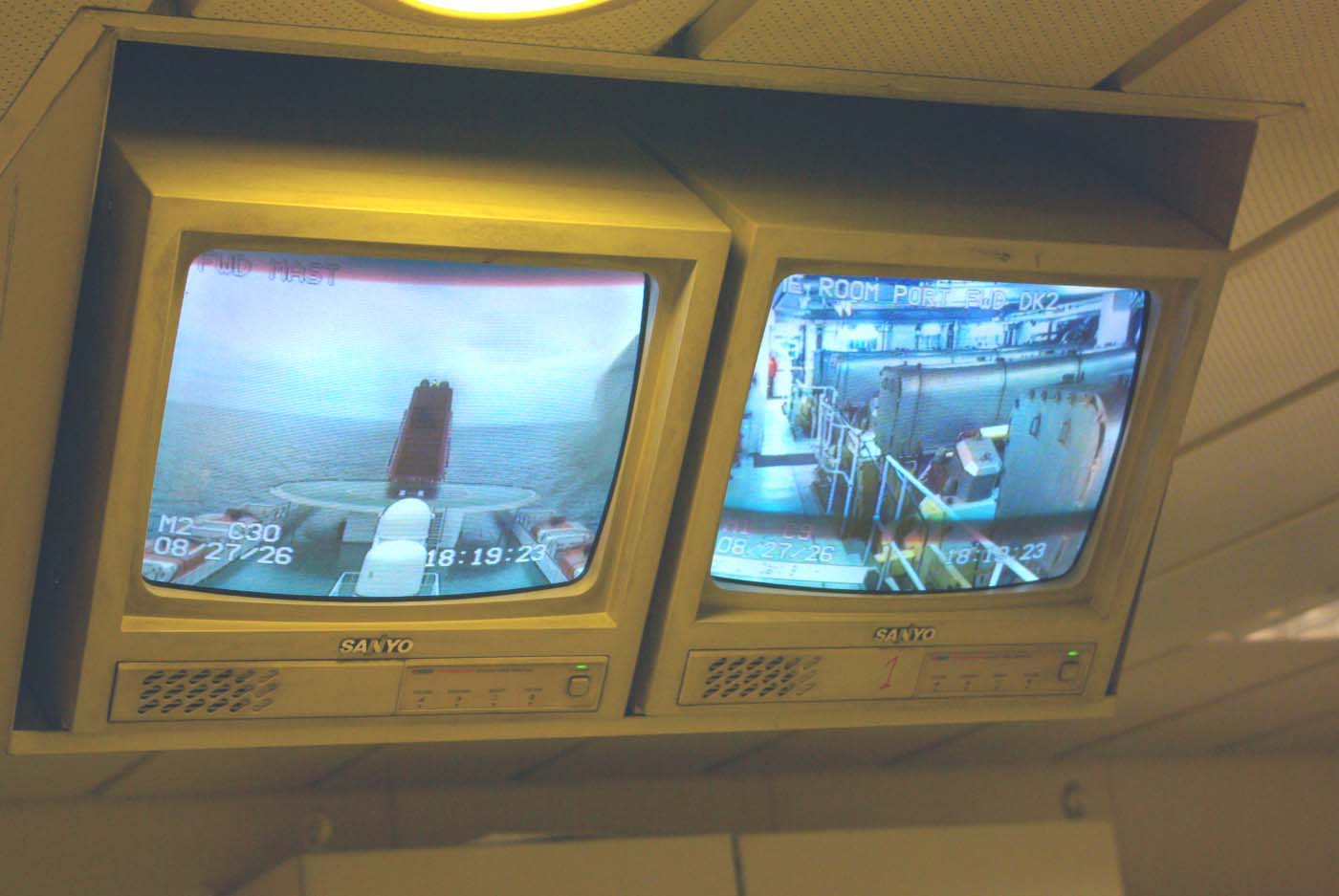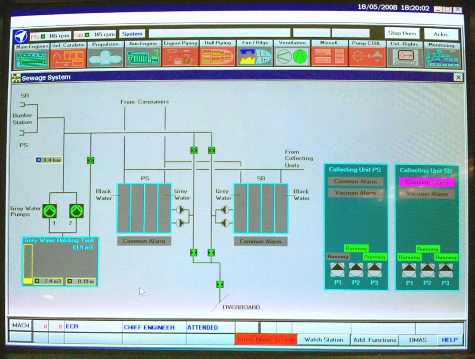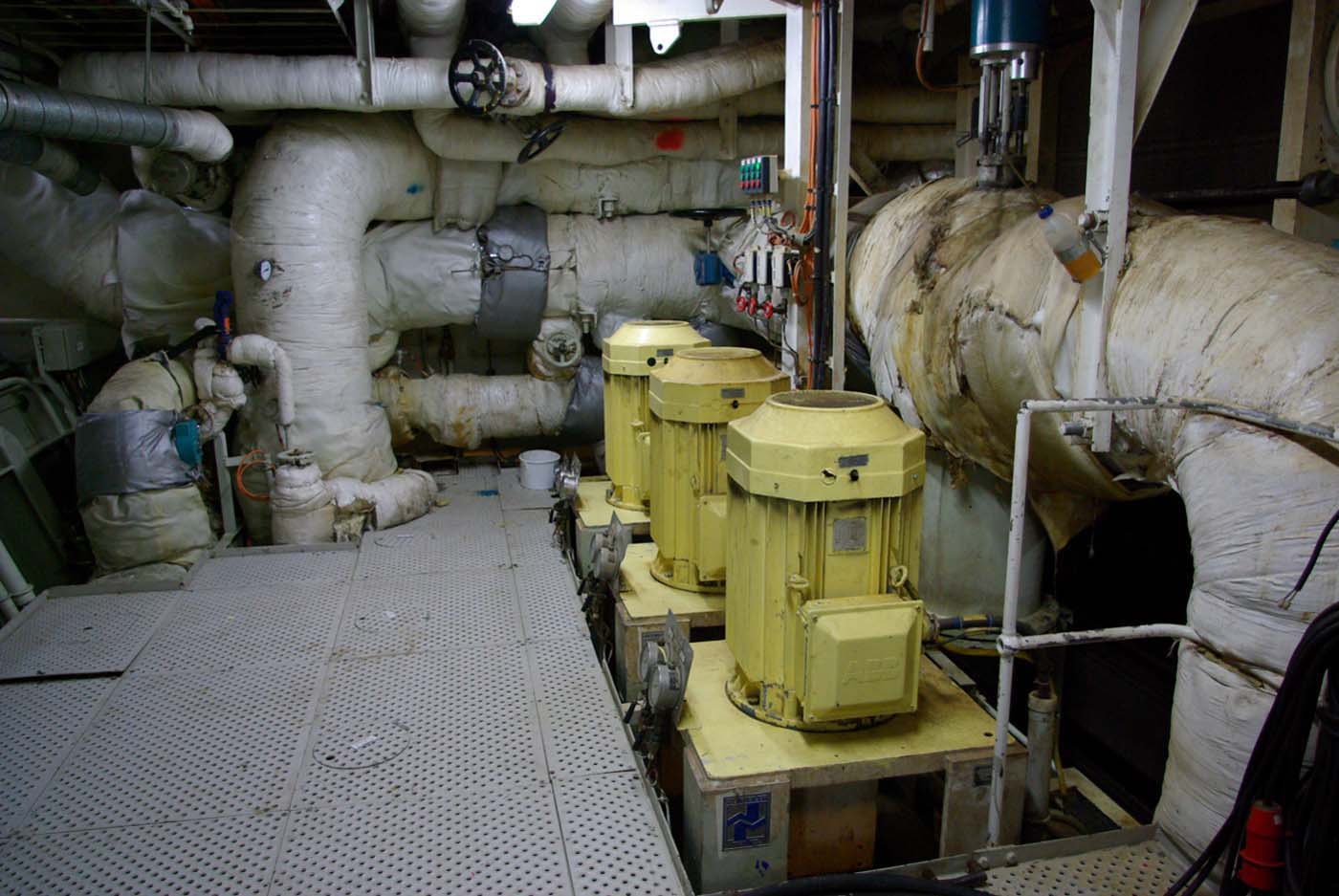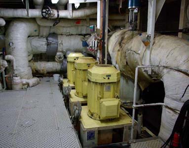 Färjan har fyra motorer varav två driver samma propeller. Alla sektioner är vattentäta varför man inte kan komma till nästa förrän föregående sluss är stängd. Vi kommer alltså in i ett dundrande utrymme där man blickar ner på fyra dieslar. De var visserligen var rejäla bumlingar men inte så hemskt stora som man skulle föreställt sig. 65.000 hästar. Tja, det kanske de kan ge? De var ju i alla fall en två meter höga och sex meter långa och de hade namnskyltar med ett välkänt företag från vårt östra broderland. Jaha, det var ju intressant.