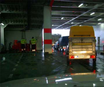 Det finns ballasttankar också. Men de används enbart för att justera färjans höjd beroende på vilken hamn de angör. Lasten, dvs. alla fordon spelar ingen roll hur de står. Det märks knappt. Fast det finns andra lite mer otrevliga tankar man måste hålla koll på också. Eftersom man är miljöcertifierade