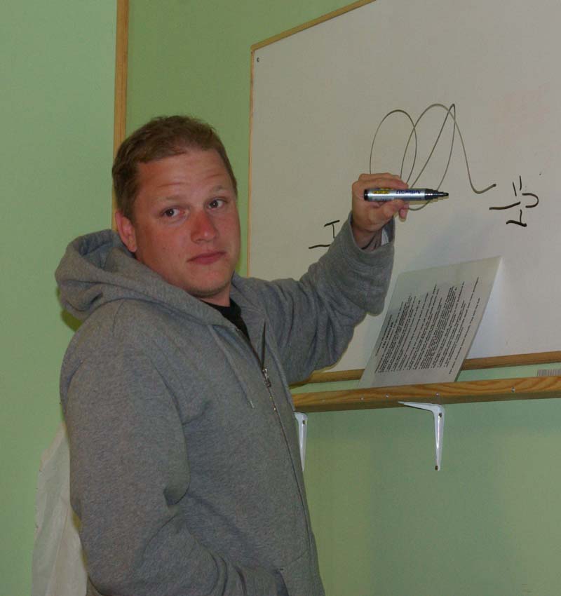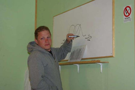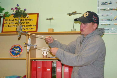 Hela det här komplicerade länkarrangemanget inklusive paddelstången behövs inte längre tack vare modern elektronik. Det är Mr. Mel halvproffs på. Eller rättare sagt, han vet vad han pratar om. Fredrik hade alltså med sig dator och mätutrustning och efter lite pillande får han till en helikopter som nästan flyger