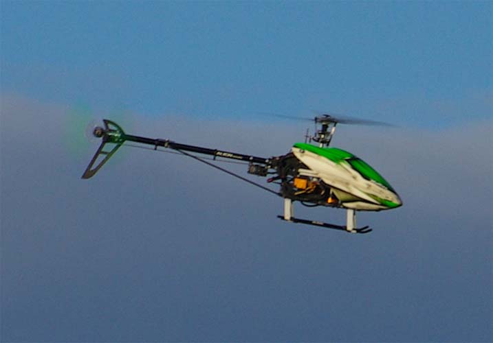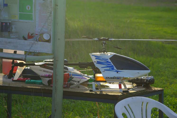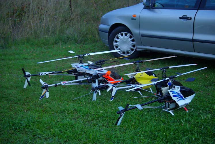 Även helikoptrar tog till väders, både el och metanolmaskiner. Dessa tingestar tycks upphäva alla naturlagar när de befinner sig i händerna på en skicklig pilot. Mattias tumlade runt sin heli i både rollar, loopar samt även inverterad hovring på relativt låg höjd. Danne Johansson hade en dramatisk flygning då servot (styrningen) till stjärtrotorn flyttade på sig vilket orsakade att helikoptern inte gick att styra mer än hjälpligt åt ett håll. Det hela slutade tack och lov väl eftersom Danne med sin mångåriga erfarenhet lyckades landa med hjälp av den hårda vinden som höll helikoptern i vindriktningen. För att inte dagen skulle ta slut för Danne fick han åka hem och hämta fler helikoptrar. Lika bra att ha nånting i reserv ifall det skulle toka sig mera. Men en Caliber 30 av fabrikat Kyosho som senast var i luften för 2 år sedan svek inte. Efter ha laddat mottagarbatteriet startade den och flög som en dröm. Mycket imponerande! Danne hade dock fel tankadapter med sig så han kunde inte tömma tanken, utan han fick helt enkelt flyga slut på soppan. Han fegade på slutet och tog den till hovringsläge innan den började hosta så att motorn inte skulle stanna på fel ställe och äventyra en autorotationslandning.
