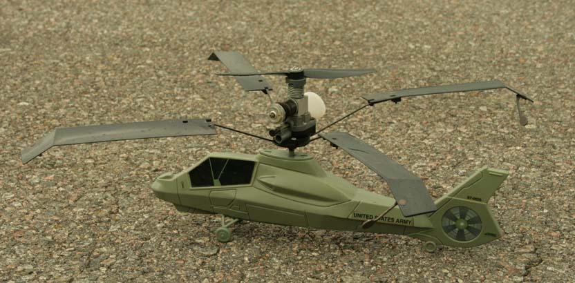 Det sitter en liten Coxmotor försedd med en vanlig propeller fastbultad i en 4-bladig rotor. Ingen mottagare, inga servon. Bara nån sorts kropp hängande i en pianotråd under rotorn. Det är allt. Förutom att rotorbladen har några märkliga motvikter fastsatta i bladspetsarna.