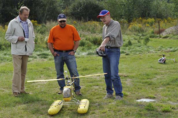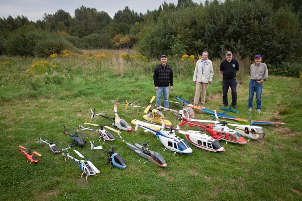 deras senaste träff deltog ingen mindre än Dieter Schlüter själv (farbrorn i mitten av bilden) fast han börjar komma till åren. Det var ju han som i mellandagarna 1969 för första gången lyckades styra en modellhelikopter genom att kombinera Bell och Hillers
