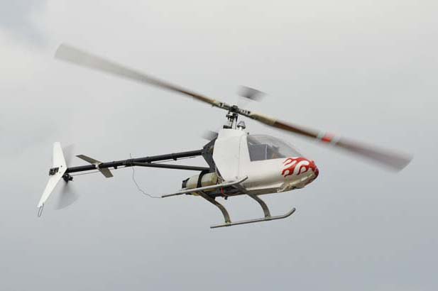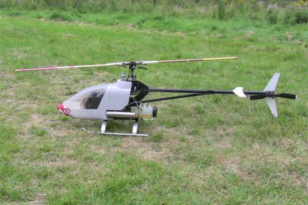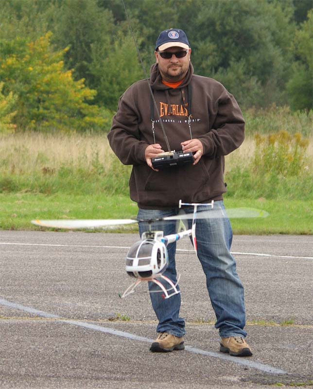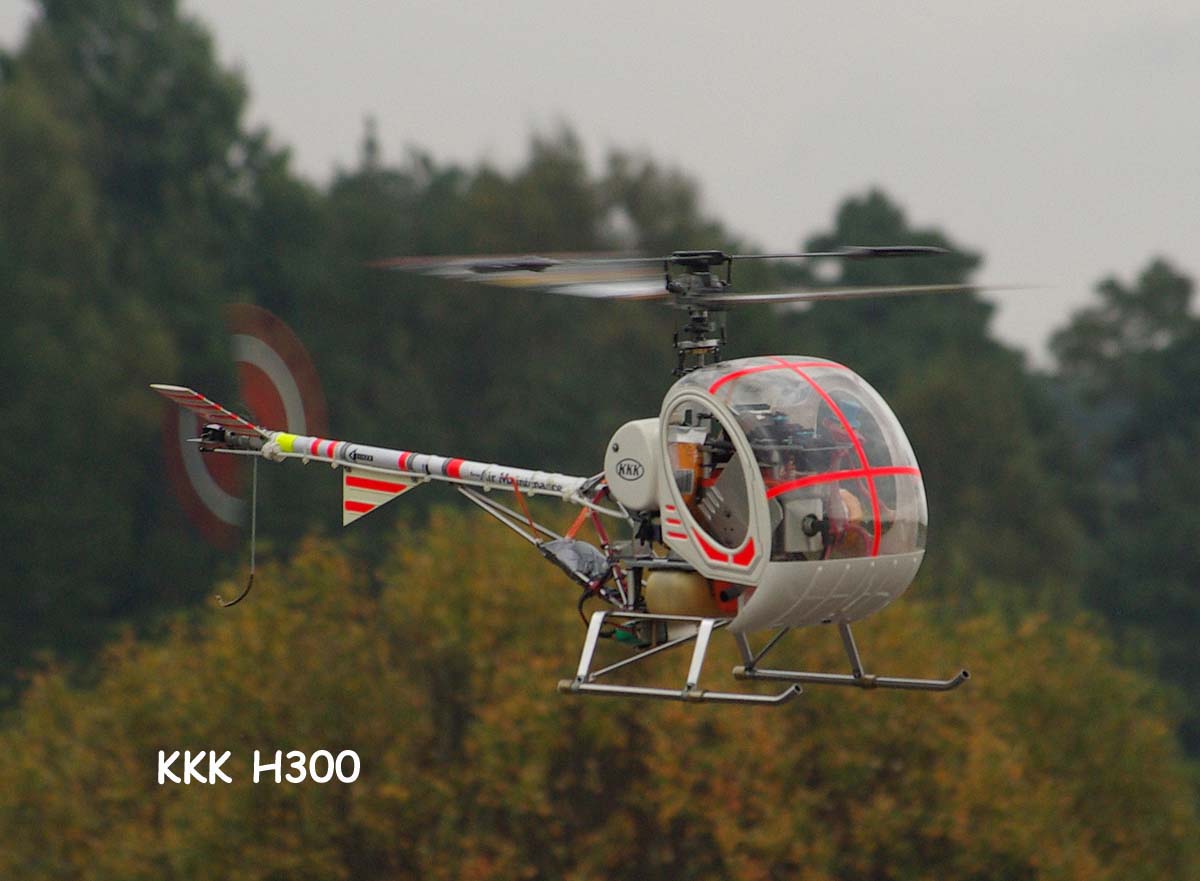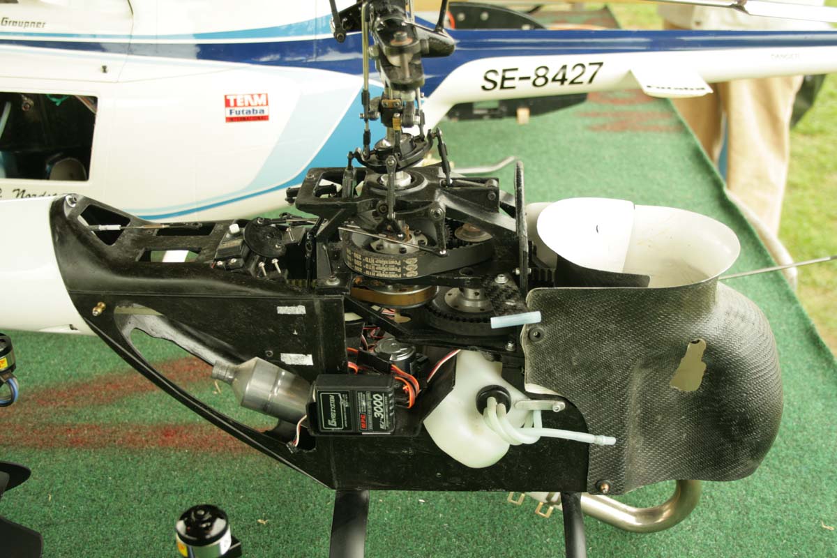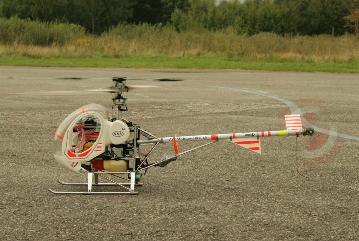 Träffens mest imponerande pjäs var ändå Patrik Gussarvs KKK. En 7,5 kg tung järnklump i form av något som ska föreställa en Hughes 300, framdriven av en 22-kubiks bensinmotor. Balanseringsvikter i form av lödtenn som Patrik lindat upp runt det som behövde viktas gjorde den inte lättare precis. Men den orkade upp utan