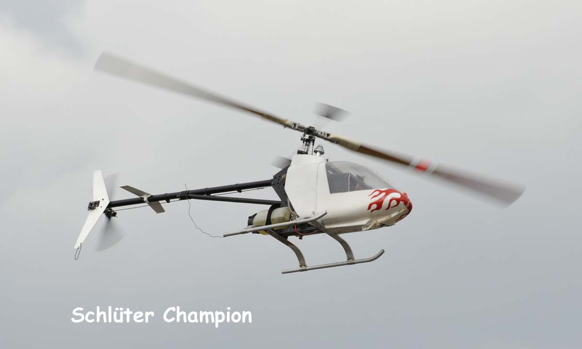 I stället blev det Per Elovsons Champion, även den spakad av undertecknad, som fick försvara Herr Diplomingenjör Schlüters heder. Vilket den också gjorde med bravur. Givetvis också den försedd med mekaniskt gyro. Är det nostalgi så är det. En kuriositet i sammanhanget är att flygvirtuosen Peter Wik lärde sig flyga på just denna modell. Han målade dit "elds-flames" i nosen på kabinen under sin tid på yrkesskolan i Vansbro.