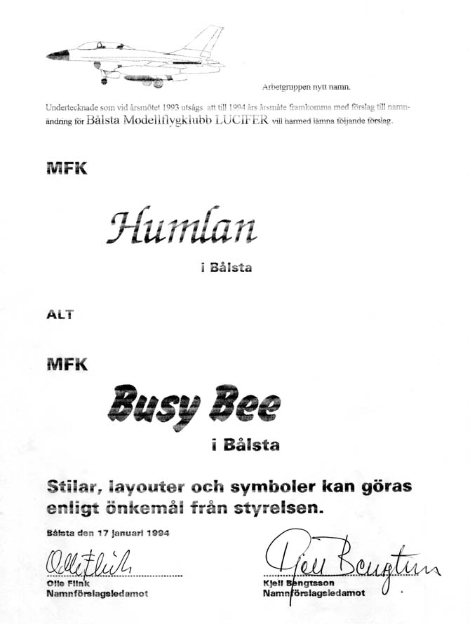ett organisationsnummer vilket blev 802471-7640, samtidigt innebärande att klubbens namn stadfästes till B�lsta Modellflygklubb BusyBee.
