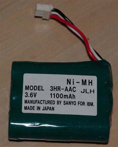 - Batteripacken tillverkades av IBM's utsökta NiMh-batterier av märket Sanyo som gjort tjänst i 3 år som cachebatterier. Sen byts de ut ovillkorligt. P/N 44L0313 och 1100 mAh som räcker för minst en timmes flygning. De verkar aldrig ge upp. Det som står utanpå går också i med några procents differens. Hur många gånger man än laddar. En tank = 250-275 mAh, konstant.
