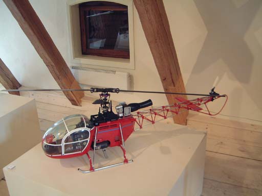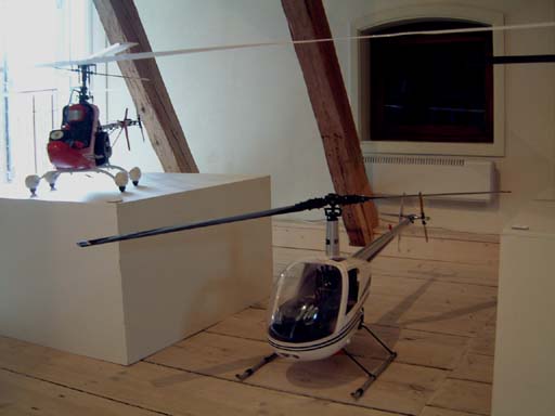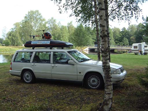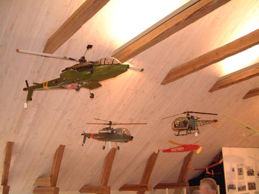 En av utställningsmodellerna, en Robbe Moskito förklädd till en Schweizer 300C (den som står ovanpå takboxen), tog vi ut och tankade upp så den fick lufta rotorbladen under uppvisningsflygningarna bägge dagarna. Vi hovrade på nära håll så publiken fick känna metanol/ricinoljelukten i näsborrarna och lite rotorflapper lyckades vi faktiskt också åstadkomma.